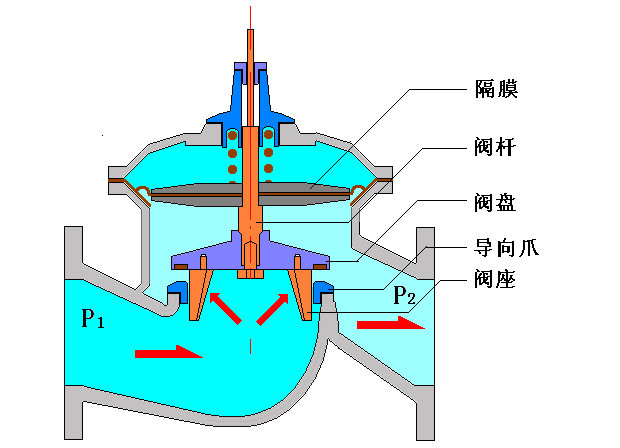 從減壓閥的過流方式分析:水流沿節流錐流向出口,有效地減少了紊流現象,有利于P2的穩定性和低噪聲。如圖六所示。
